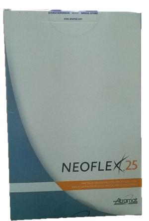 Nuestra más reciente innovación en mallas quirúrgicas Atramat®, Neoflex25 malla quirúrgica fabricada en partes iguales de (PGC-2-PoliGlicolida-co-epsilon-caprolactona) y de estereoisomero isotáctico de comopolímero de Monofilamento no absorbible (polipropileno). Presenta una absorción parcial por medio de una acción hidrolítica progresiva, en periodo de tiempo establecido, proporcionando un mayor soporte en el tejido y una menor cantidad de cuerpo extraño, favoreciendo la integración del tejido facilitando la Bio-regeración tisular.